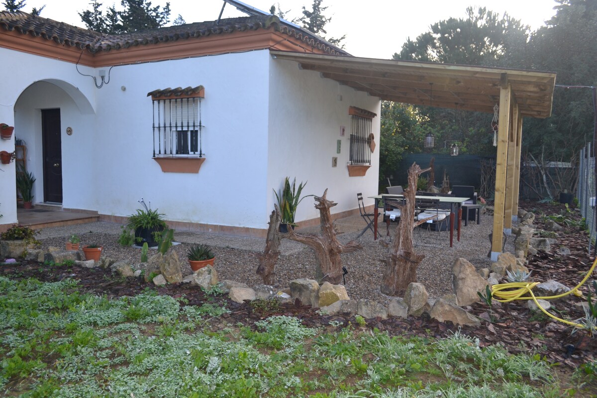 Desconecta de la rutina en este alojamiento único y relajante. Ubicada en plena naturaleza donde podras descansar y contemplar desde su porche numerosas especies de animales e incluso interactuar con algunos de ellos. A tan solo 15 minutos en coche de la playa de la barrosa, esta casa es totalmente autonoma y 100% ecologica, ya q cuenta con energia solar y filtracion de aguas grises. No están permitidas las mascotas.