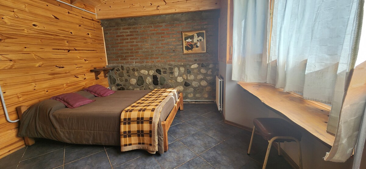 Das Hotel liegt 8 Blocks von der Innenstadt entfernt (ca. 1200 Meter) und bietet einen Blick auf den Lago Argentino, den Cerro Calafate und die Cordillera de los Andes. Komplett aus Holz im typischen patagonischen Stil gebaut, mit zwei Etagen. Im Erdgeschoss befinden sich das Wohnzimmer, die Küche, das Badezimmer und eine Sitzecke mit einem Einzelbett. Im Obergeschoss befindet sich der Hauptschlafbereich mit einem Doppelbett und ein weiterer Bereich mit einem Einzelbett. Terrasse mit Blick auf den See.
