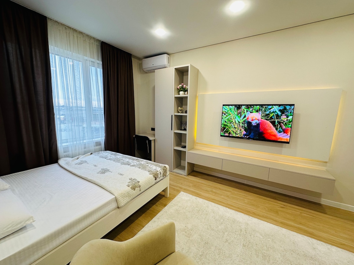 Modernes Studio mit Panoramablick im Wohnkomplex KAZAKHSTAN Dieses stilvolle Studio mit Panoramafenstern und einzigartigem Design wird dir ein Gefühl von Gemütlichkeit und Freiheit vermitteln. Geräumiger Wohnbereich, bequemes Bett, voll ausgestattete Küche und modernes Badezimmer — alles für deinen Komfort. Die Wohnung ist hell und gemütlich, perfekt zum Entspannen oder Arbeiten. WLAN, TV und Klimaanlage sind während deines gesamten Aufenthalts verfügbar. Ein kontaktloser Check-in rund um die Uhr!