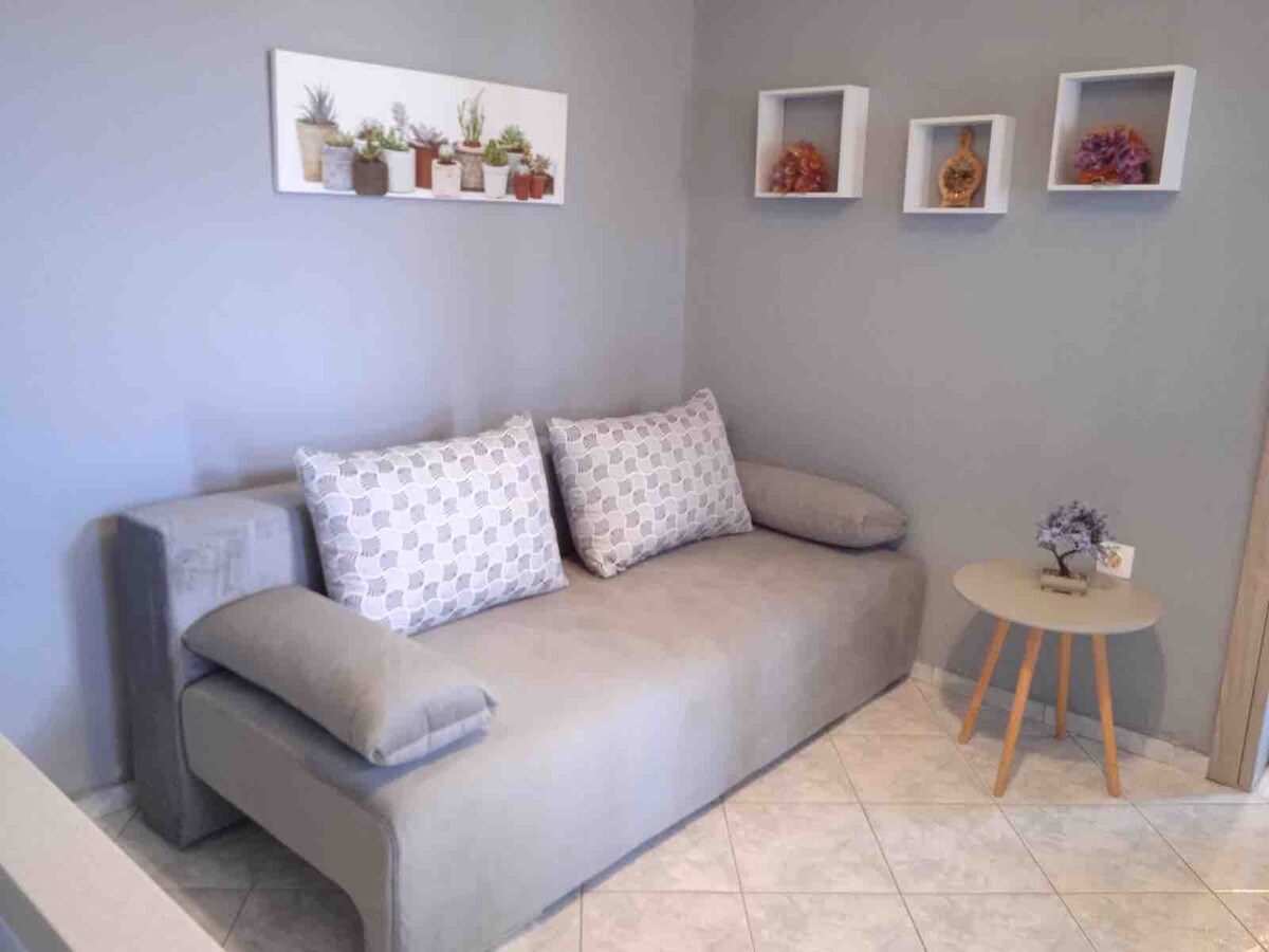 Ein luxuriöses 30 m² großes Studio, das 2022 im Erdgeschoss eines zweistöckigen Hauses mit einem schönen Garten gebaut wurde. Die Wohnung befindet sich in Agiasma, einem schönen Dorf in der Nähe des beliebten Strandes von Keramoti (10 Minuten Fahrt) Sie besteht aus einer voll ausgestatteten Küche, einem Essbereich, einem Doppelbett und einem Doppelbettsofa. Die Wohnung ist für Paare, eine Gruppe von Freunden und Familien mit zwei Kindern geeignet.