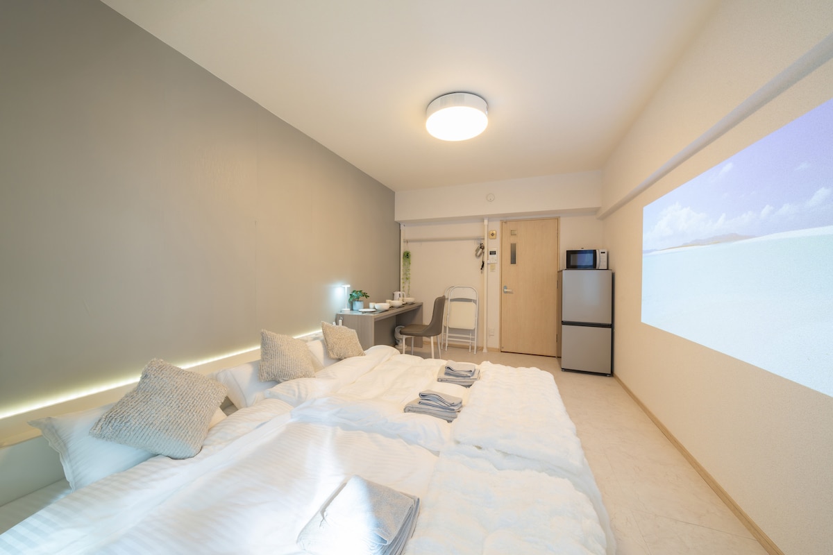 „ Ultimativer Zugang x versteckt in der Altstadt von Hakata x stilvoller Aufenthalt “ Zentral gelegen im Kulturviertel von Hakata. Sehr modern mit ausreichend Bettwäsche für bis zu 8 Personen und einem Projektor zum Entspannen im Lounge-Bereich des Studios. „Ultimativer Komfort in der Lage“ Nur 3 Minuten zu Fuß nach Nakasu Kawabata! 3 Minuten mit der U-Bahn zur Tenjin St oder Hakata St! In einem neu gebauten 50 Quadratmeter großen Interieur haben wir funktionell drei Halbdoppelbetten und zwei Schlafsofas zusammen mit neuen Möbeln aufgestellt.