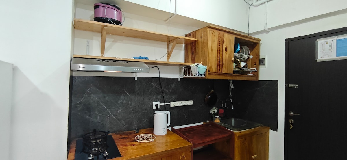 Gemütliche Wohnung im 2. Stock mit Bergblick im Herzen von Bandung! Studio-Apt mit voll ausgestatteter Küche, TV, Netflix, WLAN und super stylischem Design. Mit Poolblick kannst du den Berg am Morgen sehen, während du deinen Kaffee auf dem Balkon trinkst. Die Wohnung verfügt über 1 Queensize-Bett und 1 Zustellbett, wenn du mehr Personen unterbringen musst, Pool und Fitnessraum sind auf Anfrage :). Komplett mit einem zusammenklappbaren Esstisch für dich! Kinder übernachten kostenlos! ❗️: 50 % Rabatt für Langzeitaufenthalte, jedoch sind Strom- und Reinigungsrechnungen ausgeschlossen