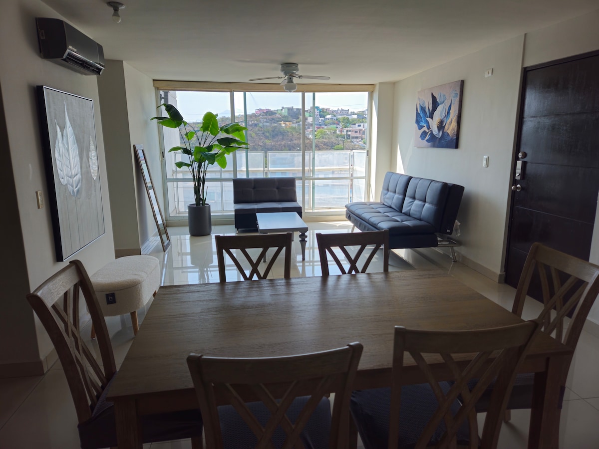 Schöne geräumige Wohnung mit allen Annehmlichkeiten. Klimaanlage, Küche, Waschmaschine/Trockner, Schreibtisch. Mehrere Balkone. Ein Badezimmer befindet sich außerhalb des Schlafzimmers und das andere innerhalb des Schlafzimmers. Du kannst den Blick auf die Stadt sehen. Restaurants und Einkaufszentrum ganz in der Nähe der Wohnung. Es hat eine private Terrasse (nach Verfügbarkeit fragen) auf der obersten Etage mit Blick auf die Stadt, falls Sie die Aussicht genießen oder etwas gebratenes Fleisch machen möchten. Ideal für ein romantisches Abendessen.