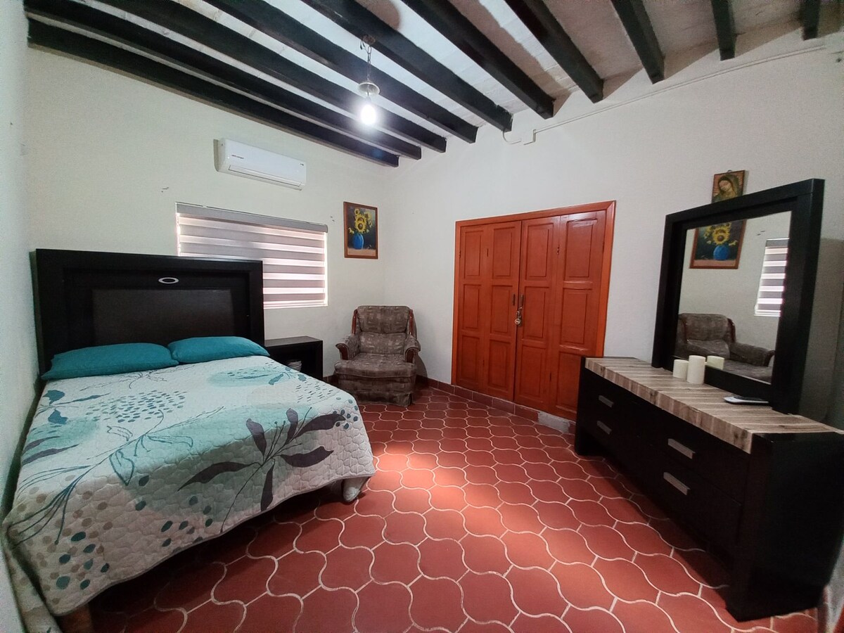 Ein stilvolles Haus mit geräumigem Wohnzimmer, Queensize-Hauptschlafzimmer mit eigenem Bad, Kleiderschrank, TV und Schreibtisch. Ein zweites Schlafzimmer im offenen Raum mit Queensize-Betten, Kleiderschrank, TV und Schreibtisch. Ein zusätzliches 2 komplettes Badezimmer für Besucher, Eingangshalle, ausgestattete Küche, mit Gasherd, Entspannen in einem Gemeinschaftsgarten mit Grill, bereit für einen Bratenbraten unter dem Überbleibsel von spektakulärem Bambus auf einem Gartentisch. Kommt zu Fuß einen Block zur IMSS