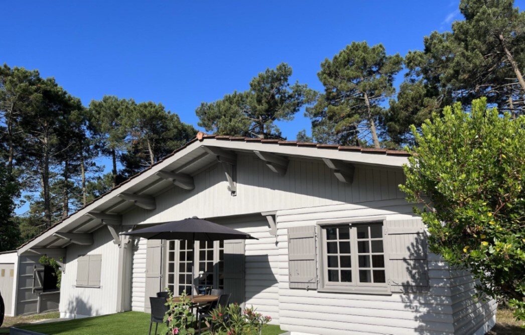 Chalet en bois de 70 m2 sur un terrain de 1000 m2 situé à l'orée de la pinède. Entièrement rénové il est spacieux et "cozi". Le voisinage est sympathique. Situé à l'entrée de la presqu'ile du Cap-Ferret on peut s'affranchir de la voiture et ne se déplacer qu'en vélo en toute sécurité: - 5 minutes du Bassin d'Arcachon - 20 minutes de l'océan atlantique - 3 minutes du tennis club de Claouey - 2 minutes du centre de balnéothérapie du Cap Ferret - 4 minutes du marché de Claouey