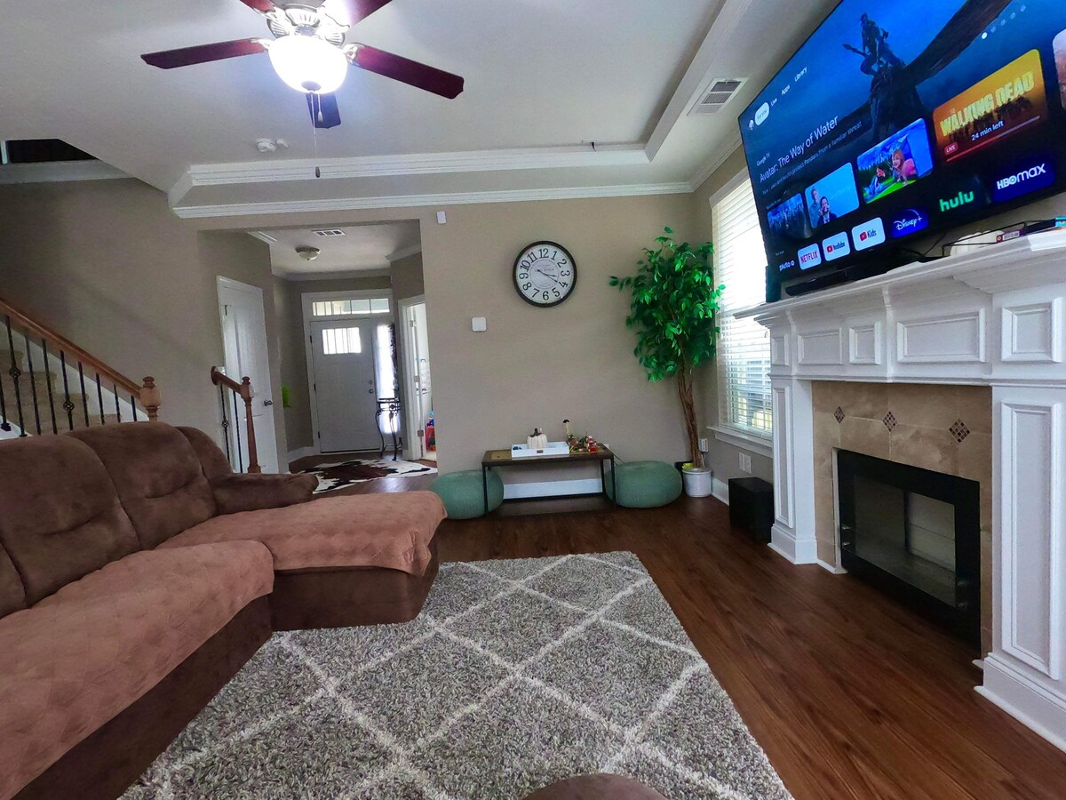 Tritt ein in den Komfort dieses günstig gelegenen Hauses mit drei Schlafzimmern und zwei Badezimmern (auf dem Hügel). Im Inneren befinden sich zwei Wohnzimmer, ein Trainingsbereich, eine voll ausgestattete Küche und weitere Annehmlichkeiten. Der eingezäunte Garten verfügt über einen in den Boden eingelassenen Salzpool, einen Gasgrill, Sitzgelegenheiten mit Feuerstelle sowie zwei Liegestühle. Jedes Schlafzimmer ist mit 55-Zoll-Smart-TVs ausgestattet, die du von deiner orthopädischen Queensize-Matratze mit verstellbarem Unterbau aus ansehen kannst. Einfache Fahrten zum Augusta National, Downtown, Fort Gordon und Krankenhäusern.