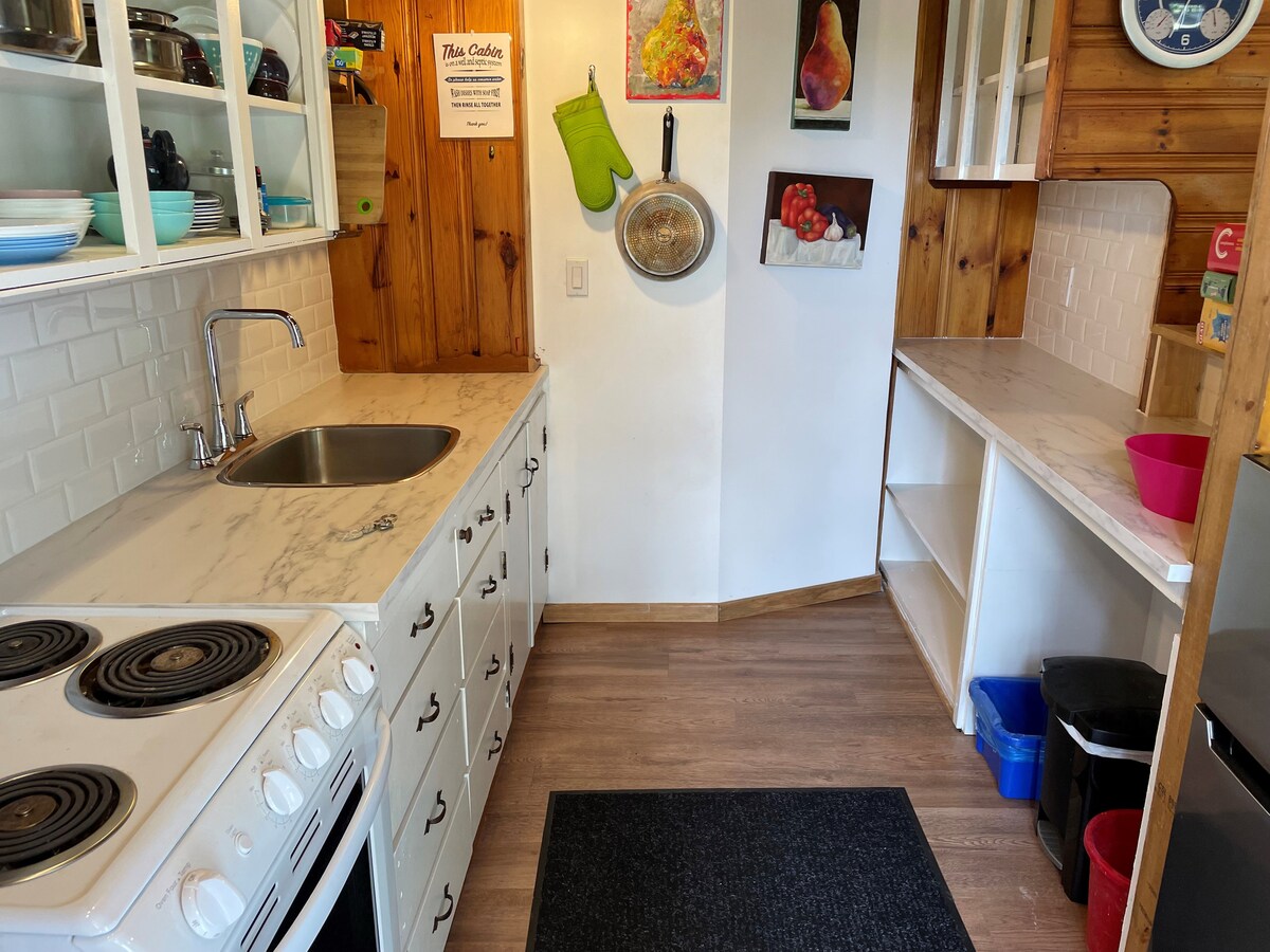Cabin is partially OFF GRID in winter months (Nov 1-May 7) No running water/shower/indoor bathroom at this time. Water is provided with water dispenser/maintained outhouse Sauna & jacuzzi tub available yr round. Note: Wood hot tub replaced in 2025 with jacuzzi spa Cabin heated by wood stove in the winter months and supplemented with a mini split heater. Firewood/kindling provided Cabin situated on heavily treed 1 acre property with a creek directly in front of a quiet municipal road
