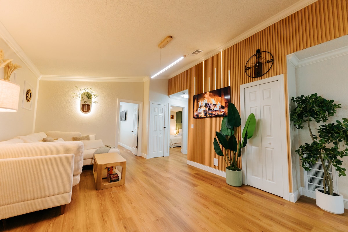 Begib dich im Postcard Paradise, einem charmanten Ferienhaus am Strand, das die Magie des alten Florida einfängt. Unser vielseitiger Rückzugsort liegt nur wenige Schritte vom Ufer entfernt und fühlt sich an, als würde man in einer Vintage-Postkarte leben. Sonnenblätter und tropische Wandgemälde setzen eine nostalgische Stimmung ein, während moderner Komfort die Dinge einfach und entspannt hält. Jedes gemütliche Zimmer ist mit handverlesenen Dekorationen, luftiger Bettwäsche und skurrilen Küstenfunden gefüllt und schafft einen einzigartigen Raum, in dem jede Ecke eine Geschichte erzählt.