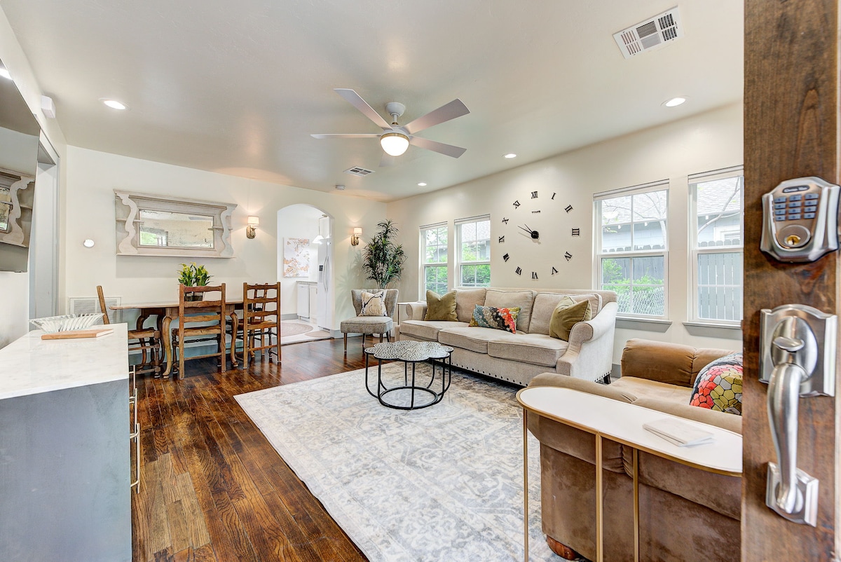 Designed to have all the extras of a fine hotel, but with the feel and space of a home. Dies ist deine Unterkunft, um gemütlich zu werden, zu entspannen und zu genießen! Dieses Haus liegt an einer Ecke eines familienfreundlichen Viertels und verfügt über eine voll ausgestattete Küche, zwei Terrassen und einen komplett geschlossenen Hinterhof. Feuerstelle und kostenlose S 'mores gehören dir auch, in diesem schönen, komfortablen Zuhause.