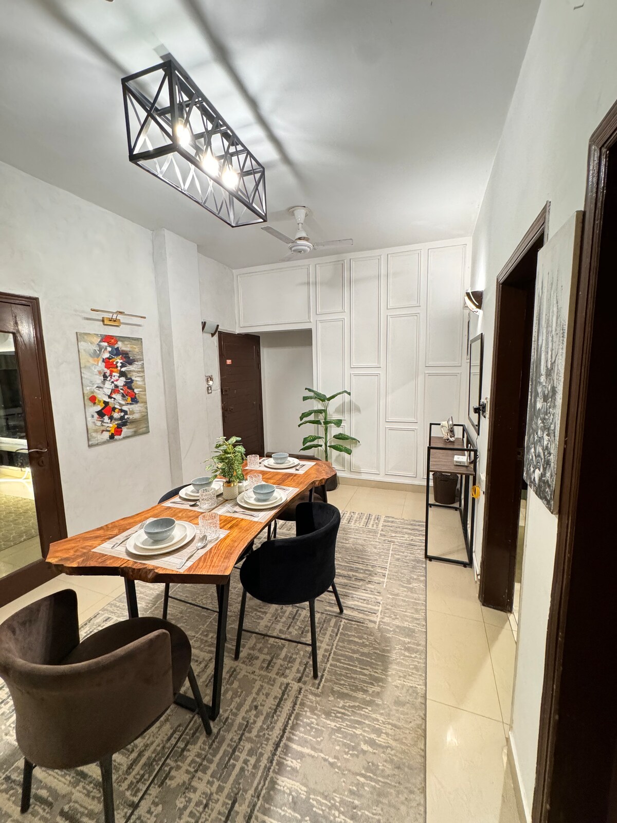 Dieses gesamte Studio-Apartment mit einem Schlafzimmer, einem Wohnzimmer und einer Küche mit Essbereich befindet sich in der DHA Phase VI Small Bukhari im 1. Stock und bietet alles, was du brauchst. Versinke in ein bequemes Queensize-Bett, lausche Musik über das JBL-Soundsystem oder entspanne im Wohnzimmer auf einem Samtsofa. Mit zwei Badezimmern gibt es kein Warten. Koche in der eleganten Küche und genieße deine Mahlzeit dann unter dem Licht der Bogenlampe bei einem atemberaubenden Meistergemälde. Genieße außerdem einen Willkommenskorb, Wasser und kalte Getränke auf uns.