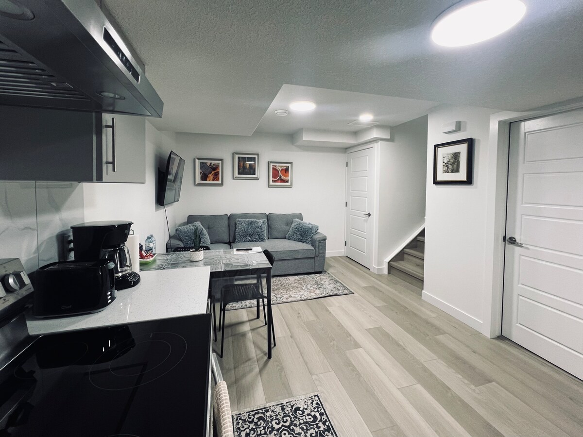 Relax and unwind in this spacious and stylish cozy suite with a view. The space is a walk-out basement suite with free parking and private entrance, patio, fenced-in yard, and hot-tub. Take in the park views while enjoying a sip and relaxing on the private patio. The suite is located in the heart of St.Albert and within walking distance to amenities, parks, trails, shopping, recreation, and a short 20-minute drive to West Edmonton mall. Small dogs can be accommodated.