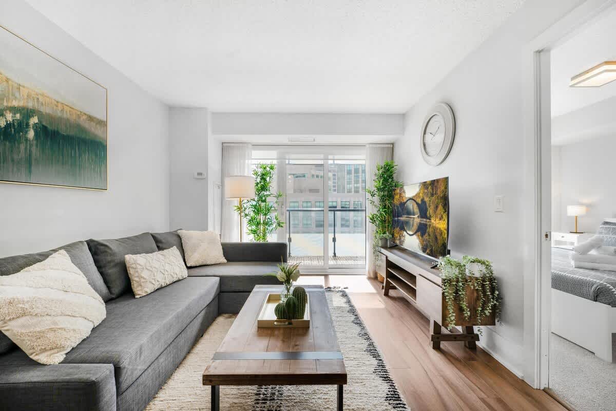 *NEUES ANGEBOT WIRD NICHT LANGE DA SEIN* Willkommen in unserer schönen Eigentumswohnung im Herzen von Downtown Toronto. Nur wenige Schritte vom Rogers Centre, Maple Leaf Square, CN Tower, MTCC, Tiff Building, Restaurants, Einkaufsmöglichkeiten und vielem mehr entfernt. Außerdem hochmoderne Annehmlichkeiten; Fitnessraum, Whirlpool, Sauna! Diese Wohnung ist hell, offen und hat eine schöne private Terrasse + Blick auf die Stadt. Die Suite ist mit einem Queensize-Endy-Bett im Schlafzimmer, einem Arbeitszimmer mit Essbereich/Arbeitsbereich, einem kompletten Badezimmer, einer luxuriösen Regendusche und einer modernen, hochwertigen Küche ausgestattet. Willkommen zu Hause!