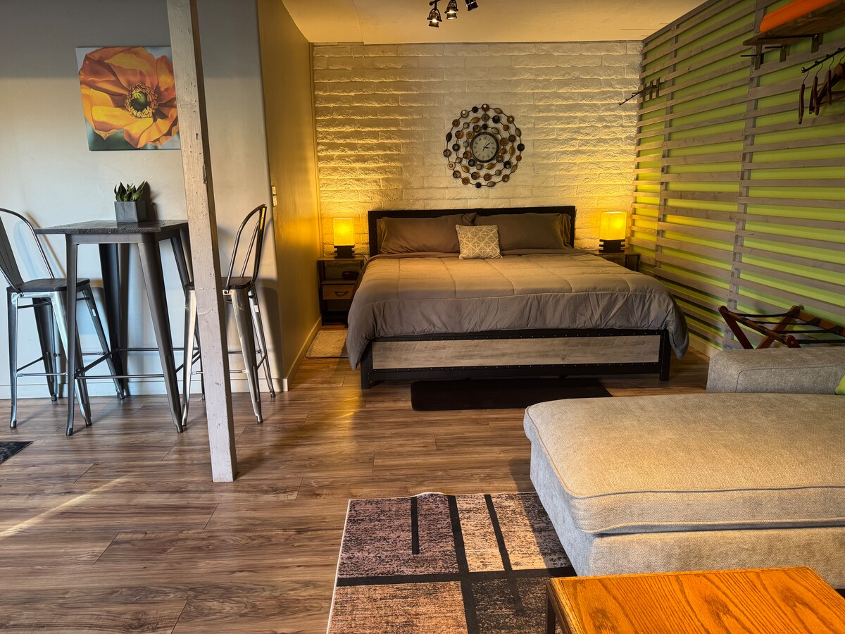 Moderner Raum mit einem Schlafzimmer (für 2 Personen, mit einem Bett). Schöne fertige Betonböden, bequeme Couch, Kamin und luxuriöses Badezimmer. Viel Platz zum Arbeiten oder Entspannen. Gut ausgestattete Küche (Kühlschrank, Mikrowelle, Backofen, Geschirrspüler, Töpfe, Pfannen usw.). Gehe in die Innenstadt oder wenn du planst, drinnen zu bleiben, bietet unser Platz SmartTV und WLAN. Buffalo Park und ausgedehntes Wandersystem 4 Blocks entfernt! Snowbowl Skigebiet 30 Minuten, Grand Canyon 75 Minuten, Sedona 40 Minuten von unserer Tür entfernt. Perfekter Ausgangspunkt für dein Abenteuer in N. AZ.!
