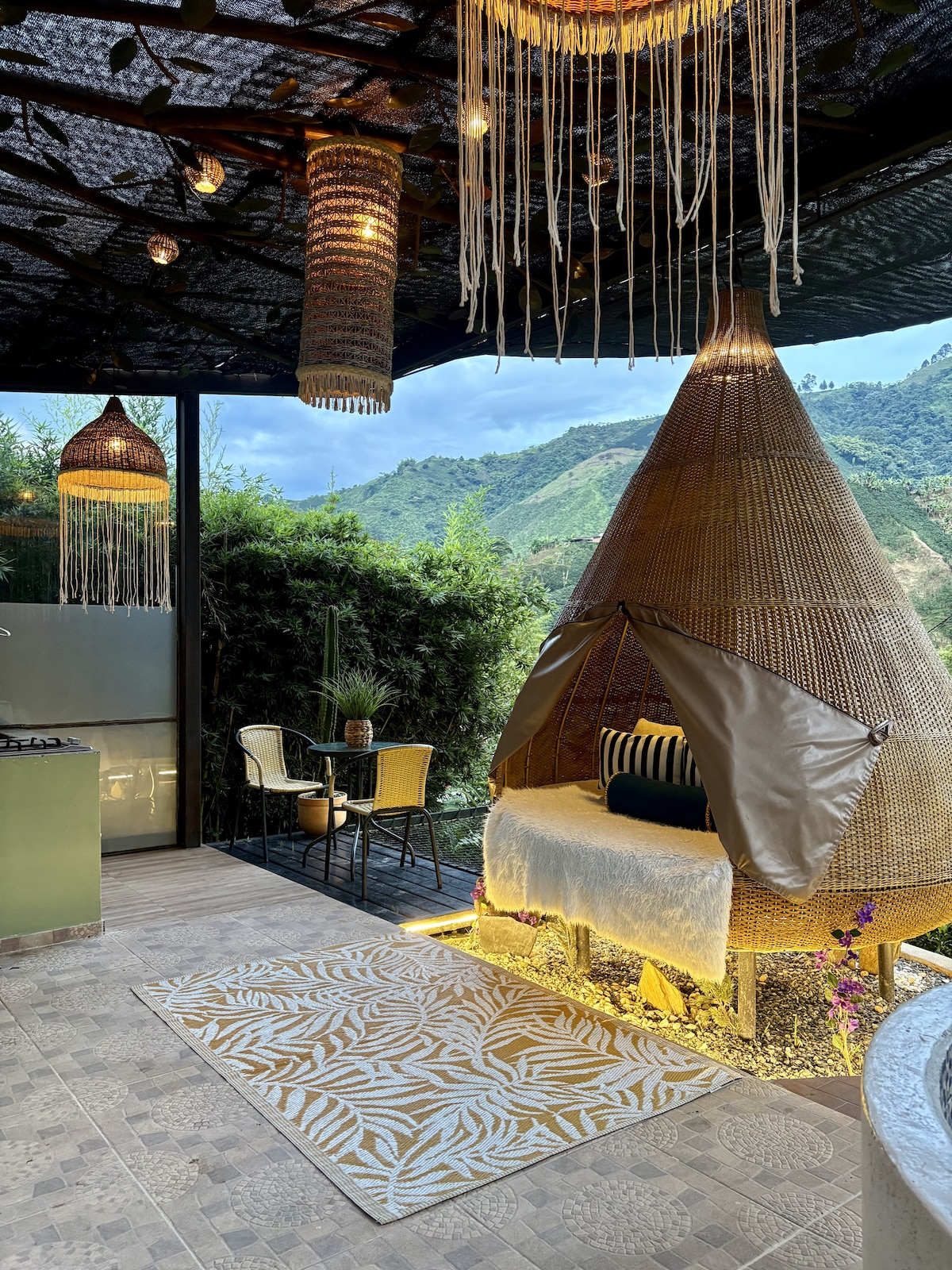 Alójate en un cómodo glamping en medio de cafetales y conéctate con el sorprendente paisaje y la cultura cafetera. Disfrutarás de una vista inigualable mientras tomas un relajante baño en el jacuzzi, o mientras te recuestas en la malla catamarán y degustas de nuestro café de origen. También podrás refrescarte en la piscina, caminar por nuestras montañas y aprender un poco de nuestra cultura. A tan solo 25 minutos de Chinchiná y 60 minutos desde Manizales