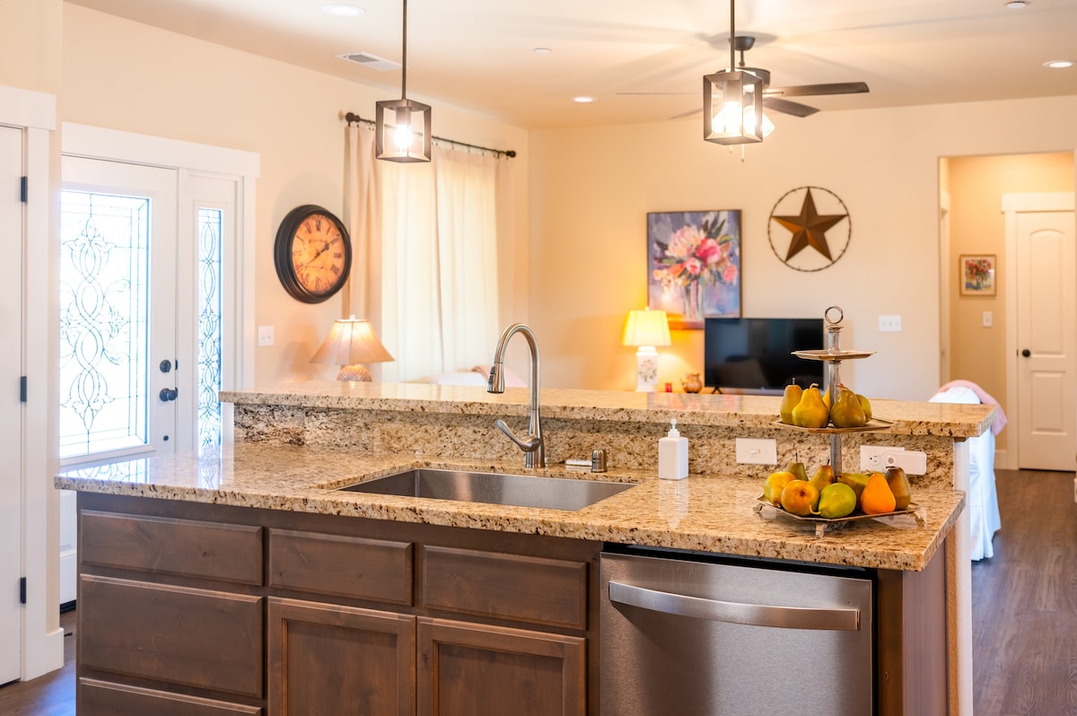 Wir haben kürzlich unsere Garage in eine schöne Studiowohnung umgewandelt. Wir haben die Unterkunft mit einem 50-Zoll-Flachbildfernseher, einem kompletten Kabelpaket, einer Bose-Soundbar/Bluetooth-Lautsprecher, Highspeed-Internetzugang, einer ebenerdigen Dusche mit zwei Duschköpfen und einer Sitzbank, einer voll ausgestatteten Küche mit Gasherd, einem Schlafzimmer mit einem Queensize-Bett, einem Wohnzimmer mit einem ausziehbaren Sofa, einem eingezäunten privaten Terrassenbereich mit Feuerstelle, Parkplätzen 30 Fuß von der Tür entfernt und allem, was du für eine schöne ruhige Nacht und/oder einen Wochenendausflug benötigst, ausgestattet. Haustiere sind erlaubt.