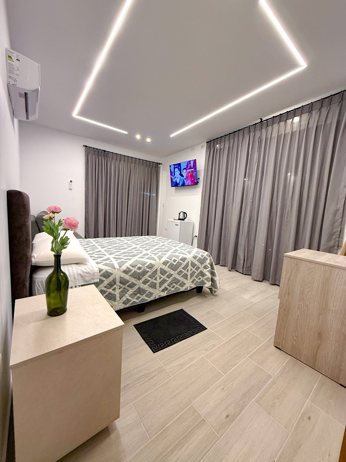 Modern beach suite just 150 m from the beach. Ideal for couples or solo travelers, this private suite features a queen-size bed, air conditioning, Smart TV, and mini fridge. Sliding doors open to a private patio with seating and a hammock. Enjoy a spa-style bathroom with walk-in shower, plus access to a shared pool and jacuzzi surrounded by tropical gardens. Perfect for a relaxing walk-to-beach getaway.