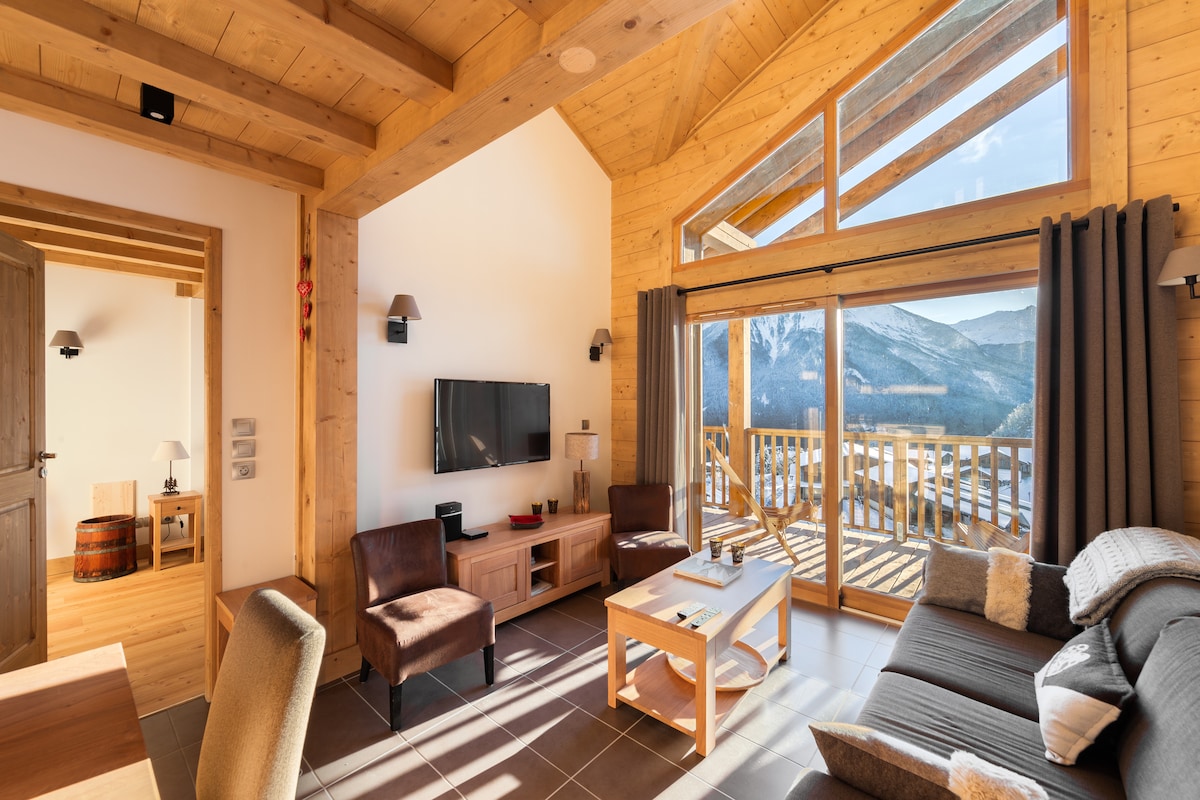 Appartement récent de 59 m2 en rez-de-jardin dans une petite résidence type chalet avec une vue magnifique sur les montagnes. Le salon donne sur une belle terrasse en bois. L'appartement est spacieux. Il dispose d'un salon avec un canapé convertible, d'une cuisine toute équipée et d'un coin repas, d' une salle de bains spacieuse, d'une grande chambre et d'un coin montagne. Une place de parking privé en extérieur. Un casier à skis avec sèche-chaussures. Linge de lit et de toilette fournis.