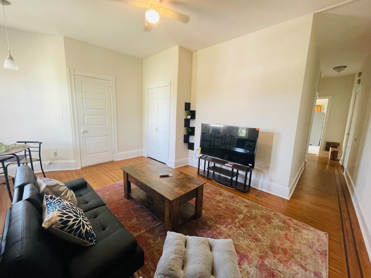 Newly Renovated, centrally located Multi-unit home in a suburban neighborhood. This 1st Floor unit is a 2BR/1BA apartment with a private entrance. Complete with all you need for a work trip, get away or longer stay. The unit features a full kitchen, living room with pull out couch. The Kitchen has full sized stainless steel appliances, dishes, cookware and small kitchen appliances. There is fast Wi-fi, Keyless entry/self check-in, Smart TV's in each room and an in unit Washer and Dryer.