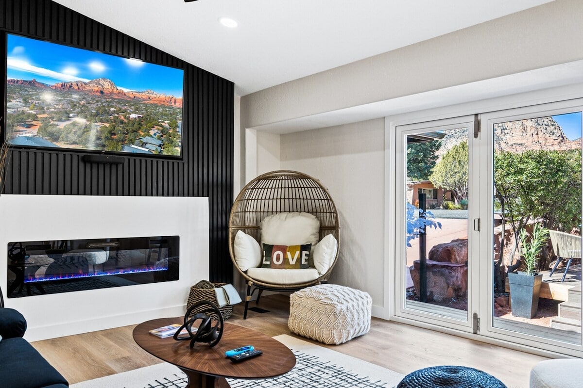 A 4000 sf remodel of a luxury modern retreat that stands alone in terms of design and style. Enjoy a private movie theatre, hot tub, and game room with pool table and bar that provides a space to hang out with friends and family while on vacation. Magnificent views from all living areas and bedrooms. Located in the highly desirable West Sedona neighborhood with all the conveniences of grocery stores, many shops, top restaurants, hiking trails, and ATV/bike rentals! Only thing missing is you!