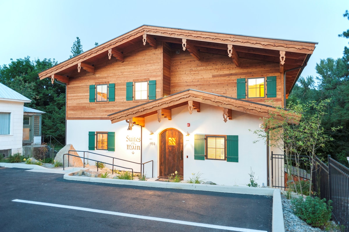 This studio at The Suites on Main is uniquely located in the heart of town, while also providing an easy escape to Barn Beach and the Wenatchee River. Park your car on site at this private self-entry building. Walk to your destinations as you explore town, dine, shop, and enjoy the endless outdoor adventure in the area. This 7-unit boutique hotel embraces the town's Bavarian architecture with modern and natural materials on the interior. Enjoy views of the mountains from your private balcony.
