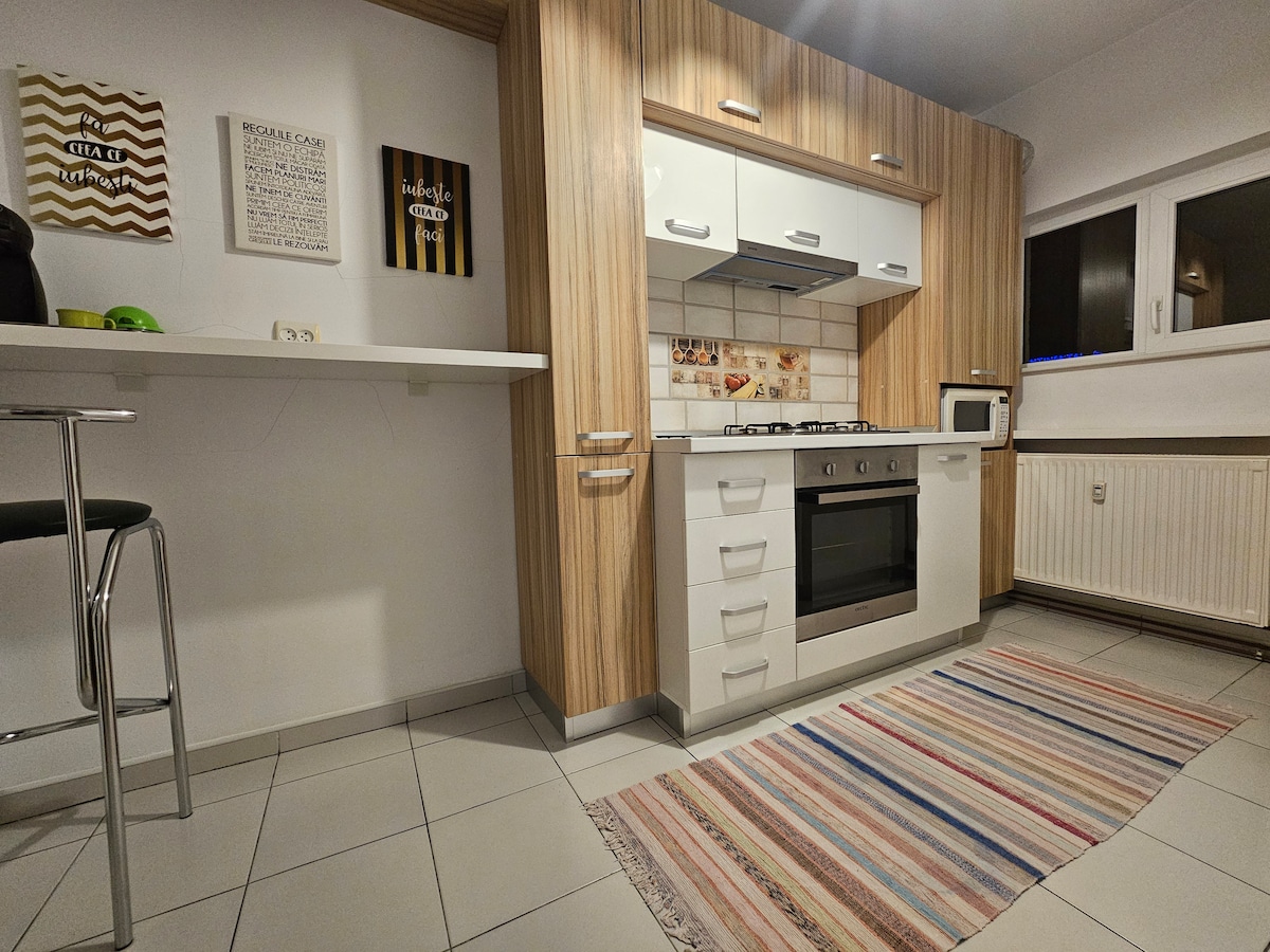 This stylish place to stay is perfect for short vacations in our city. Near to the County Hospital, City Center, City Zoo & Weekend Complex with pools and recreation area. This studio is on the 3rd floor, was refurbished in 2022 and have all the facilities for a comfortable journey. The kitchen is equipped with new electronics & furniture. The bed is new & it is perfect for 2 adults, or 2 adults & 1 child. You have tv with cable & free wi-fi. The neighbours are quiet & friendly.