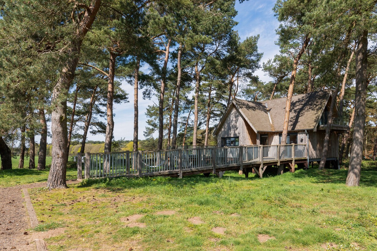 Toad Hall is our luxury lodge/ treehouse in the woods at Happy Valley Norfolk with incredible views across open unspoilt countryside with a private sunken hot tub on the decking which is air source heated. Suitable for 4 adults & 2 children. Accessible via a ramp with under floor heating, kitchen/living space. King-size accommodation. Ideally located close to Sandringham, Houghton & the North Norfolk coast. 15 mins from Kings lynn station. Perfect retreat to immerse in nature. Wifi-4GBox