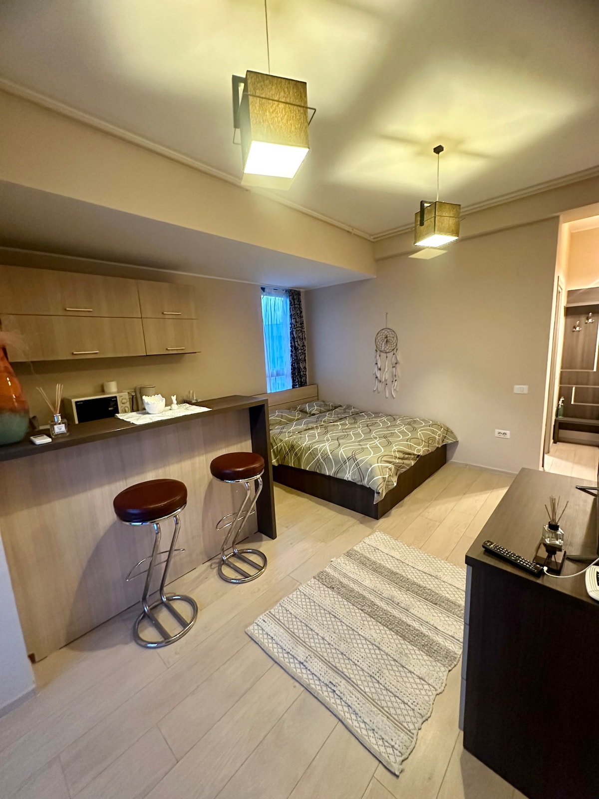 Vă prezint GG Mamaia – un studio deosebit, aflat în inima stațiunii și care oferă o panoramă impresionantă asupra mării și lacului. Locuința modernă și elegantă se află la câțiva pași de plajă și la aproximativ 10 minute de mers pe jos de cele mai exclusiviste cluburi, precum Nuba, Fratelli, Loft. Poziția excelentă face ca totul să fie ușor accesibil, astfel încât planificarea vizitei tale devine simplă și plăcută. GG Mamaia este locul ideal pentru un sejur relaxant și confortabil.