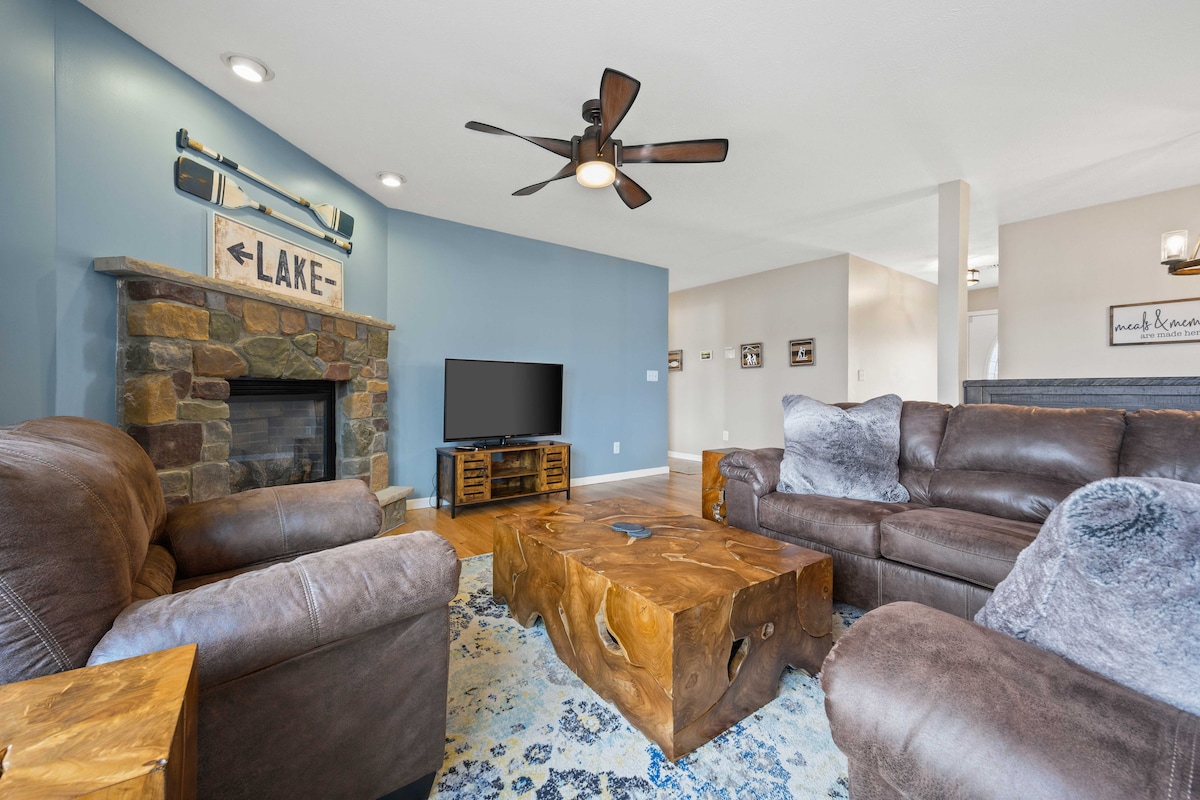 *Private Hydrotherapy 10-person hot tub *Arrowhead Lake Resort amenities FREE passes. *Pool table, air hockey, Arcade gaming table. *Gas fireplace. *Fast WiFi *Large deck with gas BBQ grill. *Firepit. *Private Kayak *Master California king bed. *Two large lakes, fishing, kayaking, playgrounds, Tennis, Pickleball & basketball courts; gym, billiards, & seasonal community events. *Close to Kalahari, H20ooohh, hiking/biking trails, waterfalls, whitewater rafting, paintball, golf, etc.