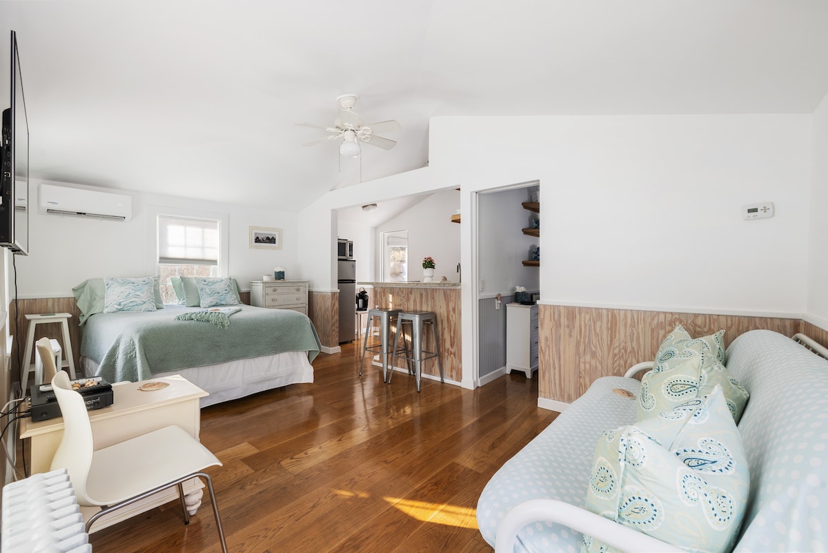 Entfliehe der Stadt, arbeite in der Natur! Völlig privates Ferienhaus mit Gartenblick, zentraler Luft und beheizten Böden. 1 Meile von unberührten Stränden und Stadtzentrum, LIRR, Hampton Jitney, 3 großen Lebensmittelgeschäften, Starbucks, Bio-Markt, Einkaufsmöglichkeiten und Restaurants entfernt. Kingsize-Bett, Kabel-TV, Kühlschrank mit Eis, Mikrowelle, Außengrill, privater Hof, perfekt für Paare, Alleinreisende, 1-2 kleine Kinder. Wir begrüßen kleine Hunde gegen eine Gebühr von 100 US-Dollar. Bitte sende uns eine Nachricht mit der Größe und Art. Arbeitendes Paar/Besitzer im Haupthaus.