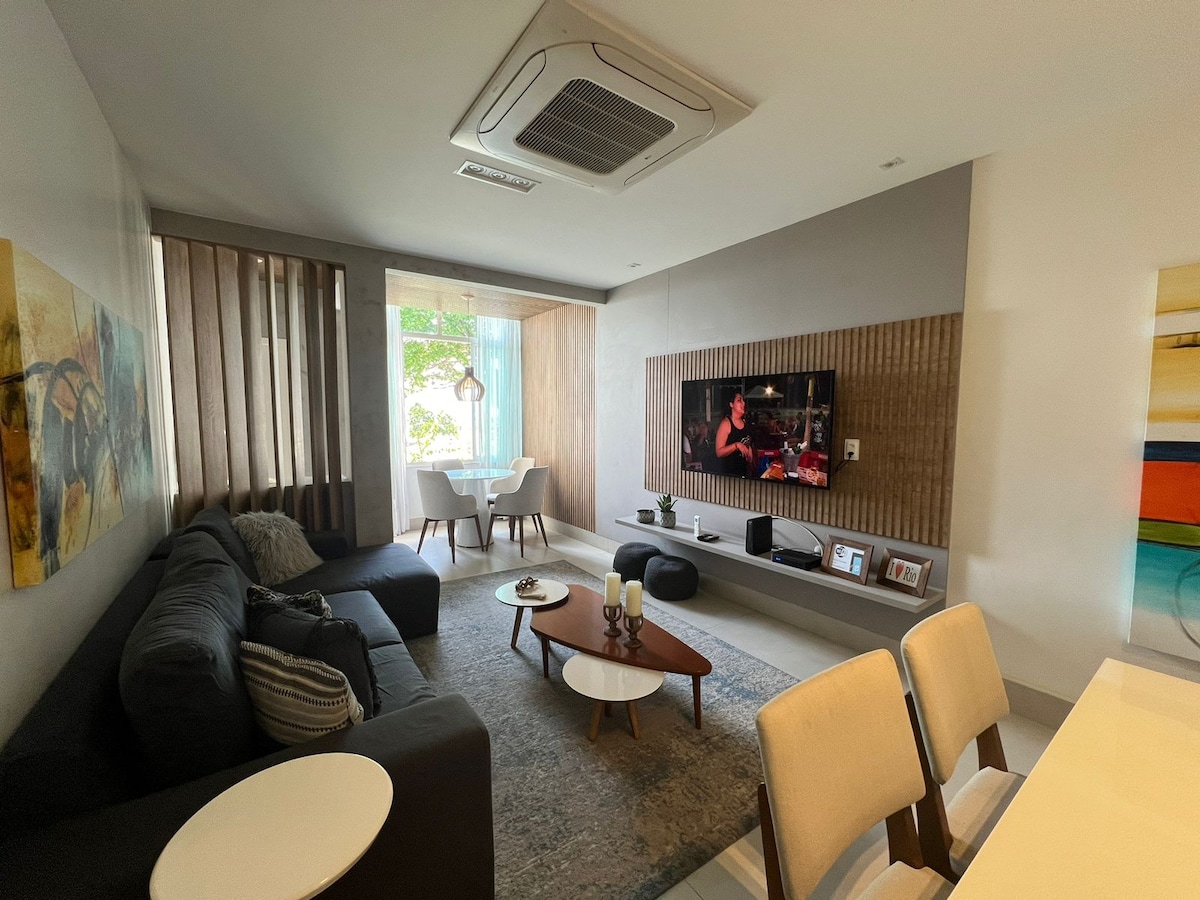 Genieße einen atemberaubenden und einzigartigen Blick auf das Meer und die Berge in einer zentral gelegenen, renovierten 2-Zimmer-Wohnung in Leme, Copacabana, ideal für Familien und Paare. Die Wohnung ist gemütlich und hat alles, was du brauchst, damit du dich wie zuhause fühlst. Ein sehr geräumiges und stilvoll eingerichtetes Wohnzimmer und eine voll ausgestattete Wohnung. Ein Schlafzimmer verfügt über ein Queensize-Bett, das zweite über 2 Einzelbetten und es gibt 2 weitere Matratzen/Futons, die bei Bedarf im Wohnzimmer aufgestellt werden können.