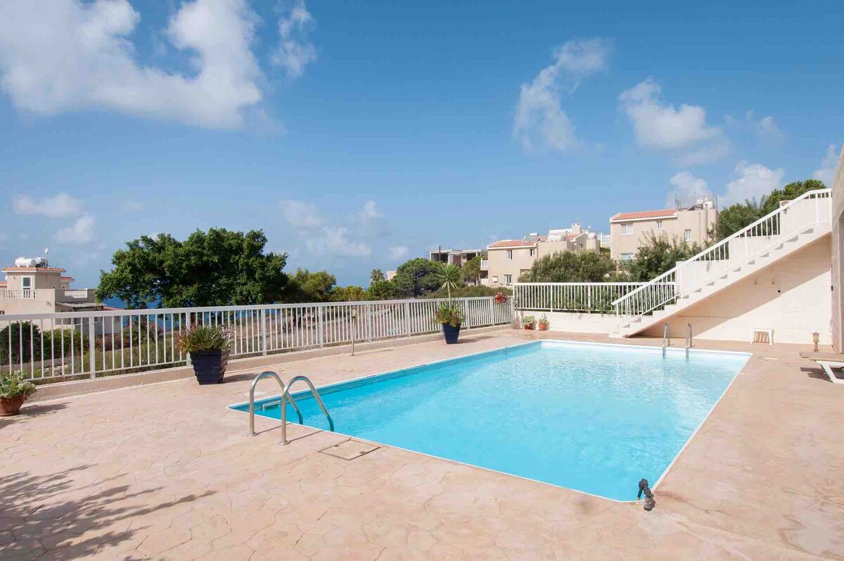 Spacious sea-view apartment with a private balcony and office. Set in a quiet & peaceful location but close enough to the attractions of Coral Bay & Paphos. Spend your days by the pool & your evenings watching beautiful sunsets. Two of the best sandy beaches Coral Bay & Corallia are only a 10 minute drive away. There are sensational coastal walks straight from the apartment and you are within walking distance of some fabulous restaurants and coastal bars. (Nature, Sentiero & Sea Caves Tavern)