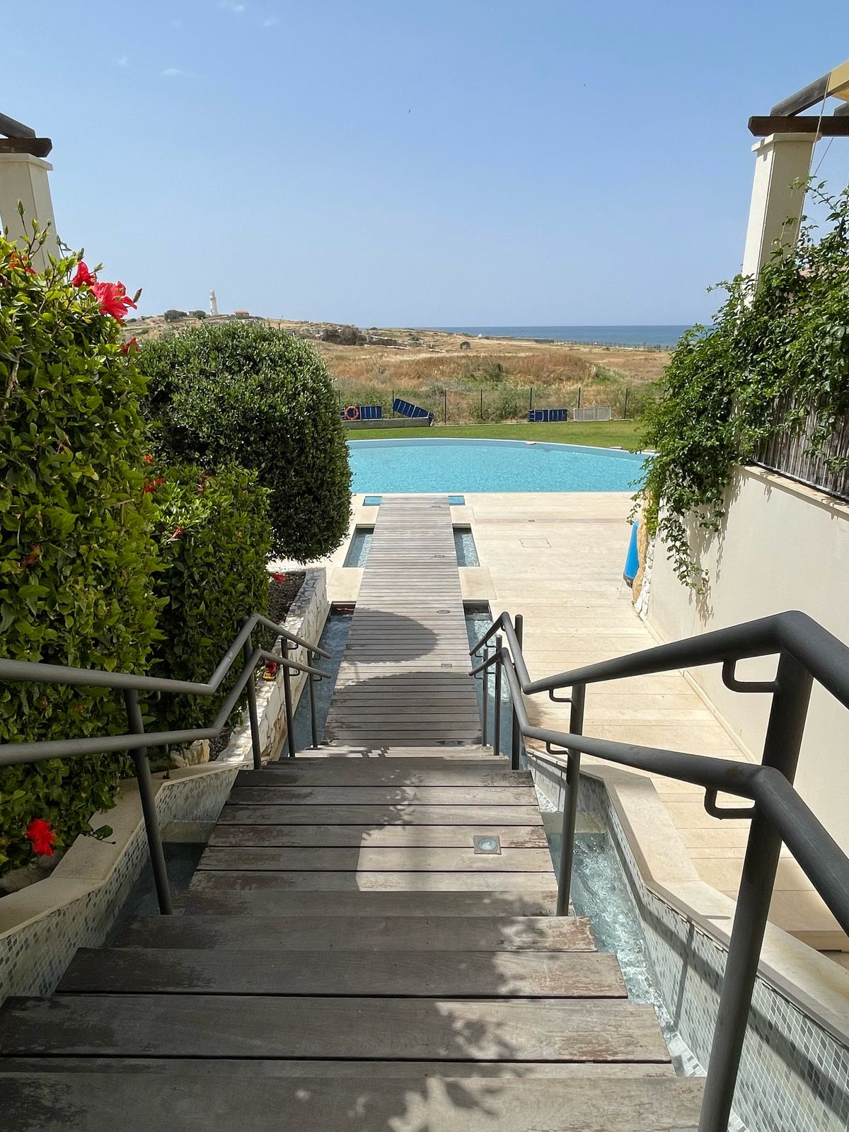 Luxuriöse 4-Zimmer-Selbstversorger-Villa mit privatem Swimmingpool und privaten Stufen zum Strand in Coral Bay, Paphos. Über einem Sandstrand, ideal zum Schwimmen und Sonnenbaden. Nur wenige Gehminuten von den Tavernen, Cafés, Bars, Supermärkten und Bussen entfernt.