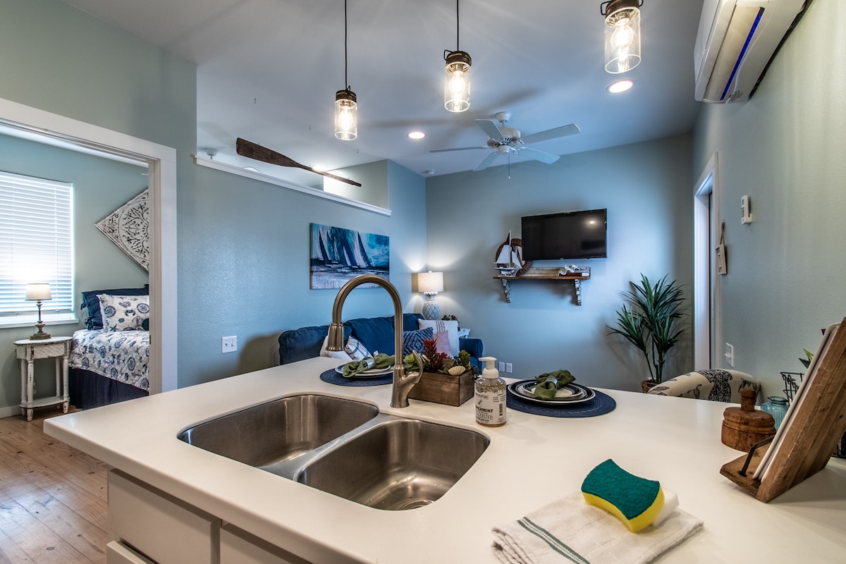 Eingebettet im Herzen der Stadt, sind wir nur wenige Minuten von Restaurants, Geschäften, Unterhaltung und den glitzernden Ufern der Corpus Christi Bay entfernt! Erkunde den nahegelegenen Cole Park, den Pier und erlebe malerische Sonnenuntergänge am McGee Beach. Entspanne dich in einem Kingsize-Bett mit hochwertiger Bettwäsche. Entspanne dich im Badezimmer mit einer spa-ähnlichen Badewanne. Die Küchenzeile verfügt über einen Minikühlschrank, eine Mikrowelle, eine Mocamaster für Kaffeeliebhaber und einen Berkey-Wasserspender. Speise unter dem texanischen Himmel auf deiner privaten Terrasse!