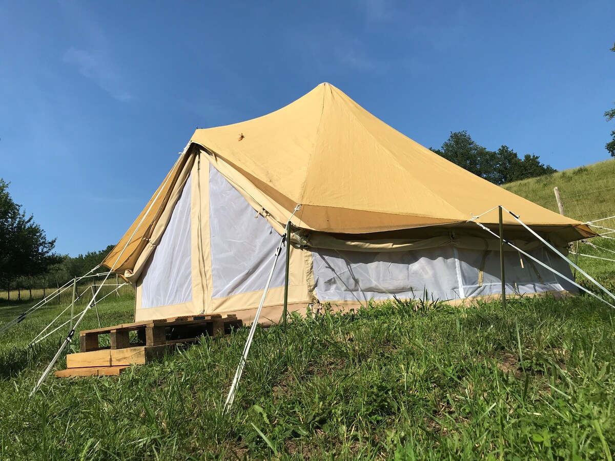Luxury glamping Lotus Belle tent in the serene Corrézien countryside, ideal for couples or small families. On our small six-pitch campsite, the tent offers a calm, relaxing space with a comfortable bed, linens, and a private kitchen area. Enjoy our pool, on-site bar, and delicious pizzas, or wake to birdsong and explore nearby trails and villages. Unwind in the peaceful, private natural setting for a unique boutique glamping experience with full comfort.