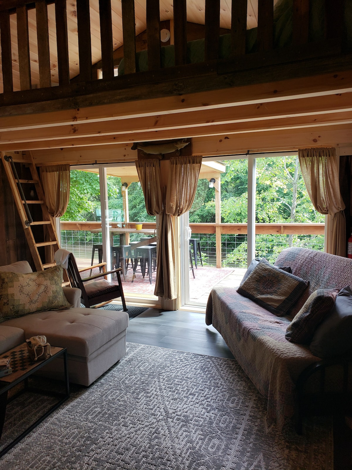 We look forward to welcoming you to the secluded beauty of our space, designed and built by my husband on our 20 acres of wooded property in the rolling hills of Central Ohio. A floor-to-ceiling glass front provides you with a view of fields green in summertime and ripe with goldenrod in the fall, four outdoor deck spaces invite you to relax in the beauty of nature, and a second story loft suite with a soaking tub are ready to provide you with rest and refreshment.
