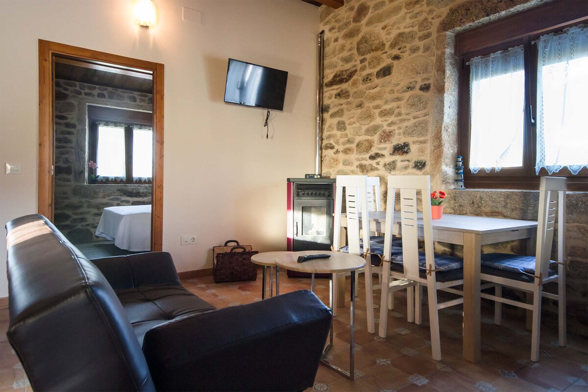 Charmantes Steinhaus in der ruhigen Landschaft von Rías Baixas. Es ist ideal für Familien oder kleine Gruppen und verfügt über einen Kamin, schnelles WLAN und einen atemberaubenden Meerblick. Genießen Sie üppige Wanderwege, versteckte Strände, galizische Kultur und Gourmetfreuden, alles nur 30 Minuten von Santiago de Compostela entfernt.