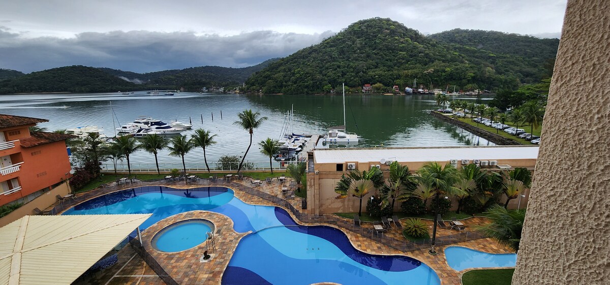 Hotelzimmer in Ilhabela mit einzigartigem Blick auf das Meer in einer privaten Eigentumswohnung. Mit Frühstück inbegriffen. Mit Lofts ausgestatteter, privater Balkon und privates Badezimmer. Es verfügt über WLAN, Parkservice und Pool. Haustierfreundlich und Zugänglichkeit. Strände und Wasserfälle. Restaurant, Märkte und Bäckerei. Unsere Eigentumswohnung liegt zwischen dem Strand von Ilha das Cabras und dem Strand von Ilhote, einer privilegierten Lage mit einem schönen Blick auf das Meer.