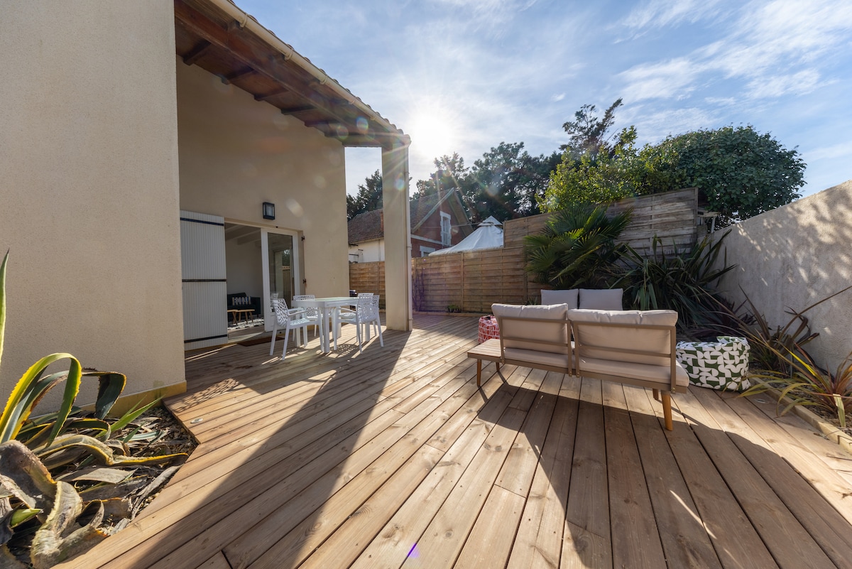 Villa d’architecte neuve de 170 m², classée 5 étoiles meublé de tourisme, proche plage, commerces et forêt. 4 chambres climatisées avec 4 salles de bains privatives. Le salon lumineux s’ouvre sur la terrasse grâce à de grandes baies vitrées à galandage, pour une vraie vie dedans-dehors. Terrasse en bois exposée sud-ouest, piscine chauffée et sécurisée. Cadre paisible entre nature et océan. Conciergerie incluse pour un séjour tout confort.