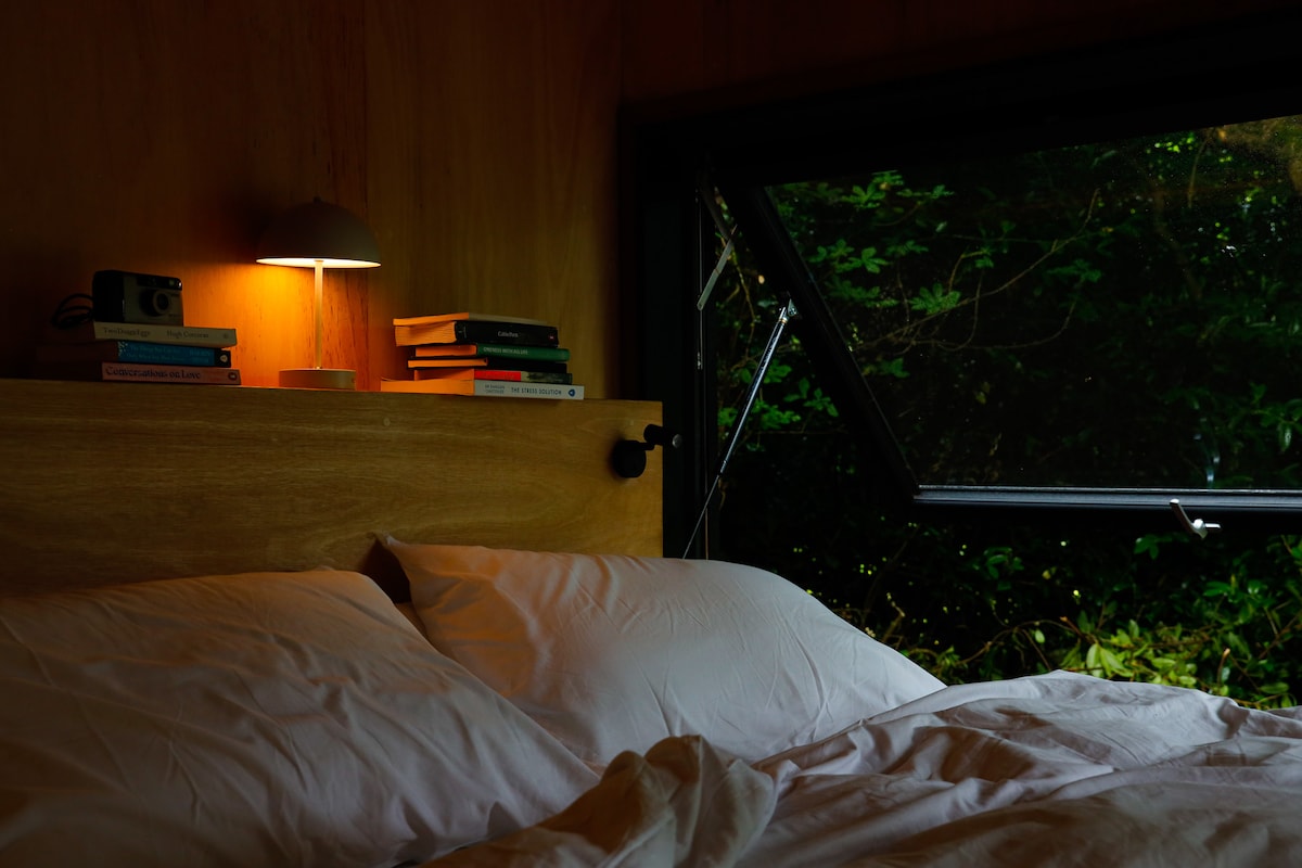 Tired of screens? Escape to this secluded off-grid cabin, where nature, peace, and fresh air await. Sitting on 300 acres of woodlands, meadows and a lake, the cabin is nestled into the edge of a laurel wood. Enjoy showers looking out over a chestnut tree, cook over fire outdoors, or get cosy reading books next to the stove. The cabin is designed for the "always on" to switch off - providing space to lock phones away and go analogue in nature with everything you need and nothing you don't.