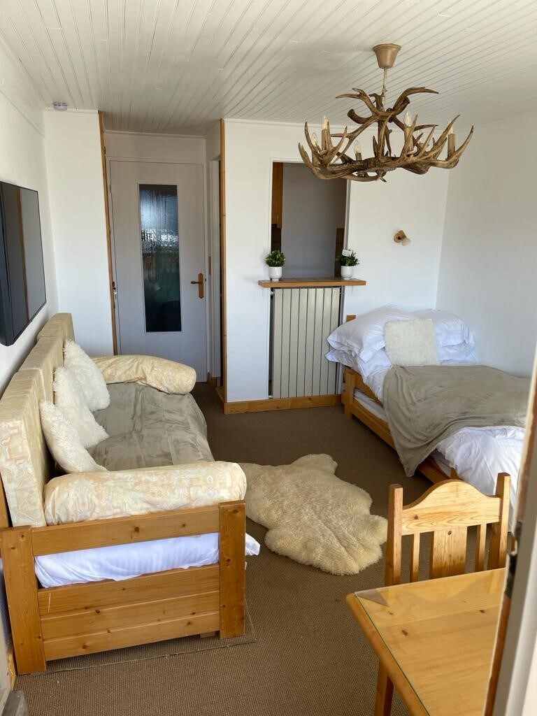 TARIF CURE 900€/21nuits Bien lire dans PLANS - description du quartier pour accès station Ce logement d’environ 30m2 est paisible et offre un séjour détente pour toute la famille. Situé au rez-de-jardin du chalet, vous pourrez profiter de sa petite terrasse extérieure, il est entièrement meublé et peut accueillir jusqu’à 4 personnes. Le studio dispose d’un canapé lit (160/200) et deux petits lits superposés 1 Chien accepté sous conditions (tarif supplémentaire 5€/jour) Chat non acceptés
