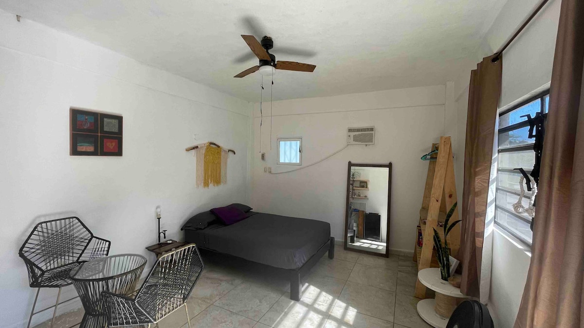 Independent ground-floor studio with all the comforts you need to enjoy Cozumel. It features a king-size bed, air conditioning, a fully equipped kitchen, a small table, a mini-fridge, a private bathroom with hot and cold water (heated by a solar water heater), and free Wi-Fi. Ideally located for saving on transportation, as restaurants, bars, and services are just steps away. On weekends, you can expect a lively urban atmosphere until around 1:30 a.m.