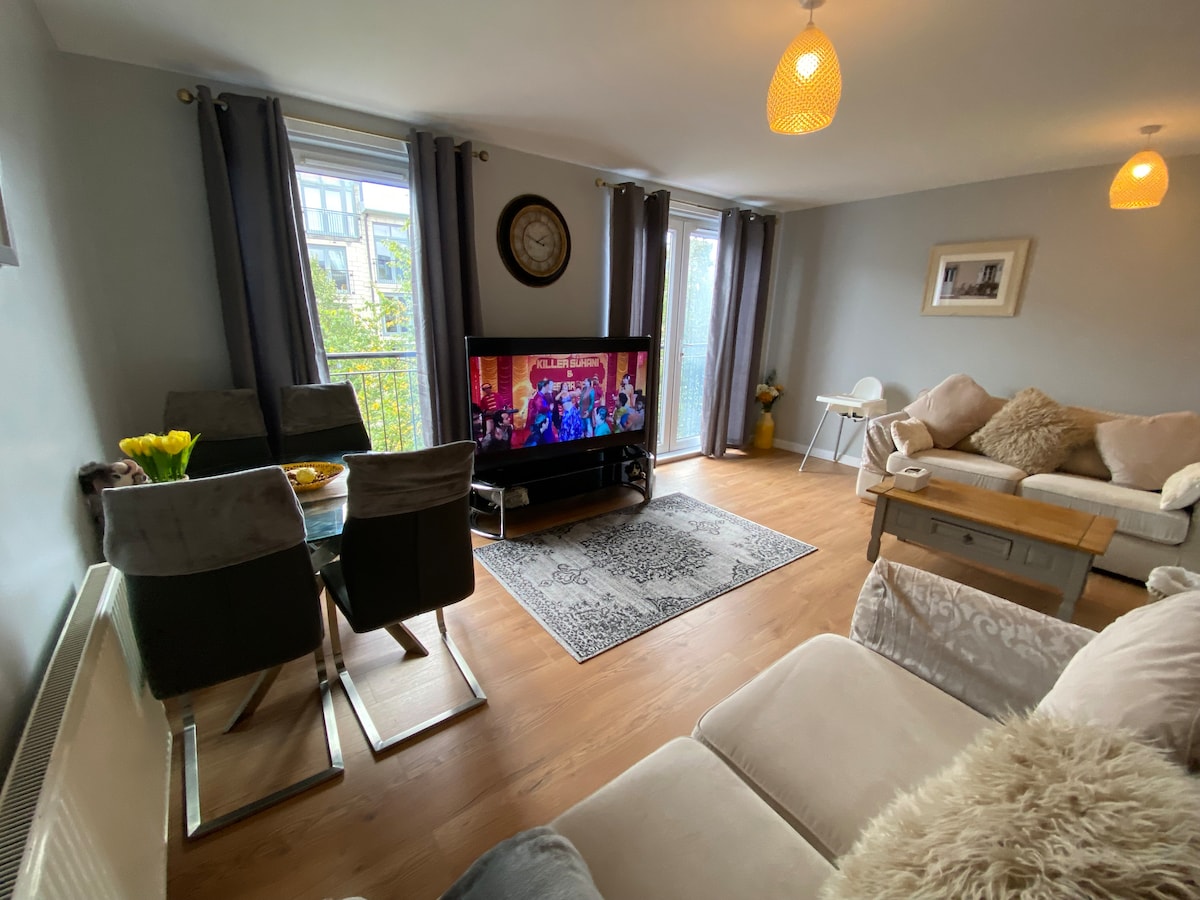 Eine schön eingerichtete helle, helle und geräumige Wohnung mit zwei Schlafzimmern (mit kostenlosem Parkplatz) in unmittelbarer Nähe des Stadtzentrums von Edinburgh/ Murrayfield Stadium/Edinburgh College und Strand beliebt bei Touristen und Einheimischen - tolle Unterkunft. • Komplett ausgestattet mit allem, was du während deines Aufenthalts brauchst. Highspeed-WLAN und 65 Zoll 4K Smart-TV mit Netflix-Filmen und Unterhaltung