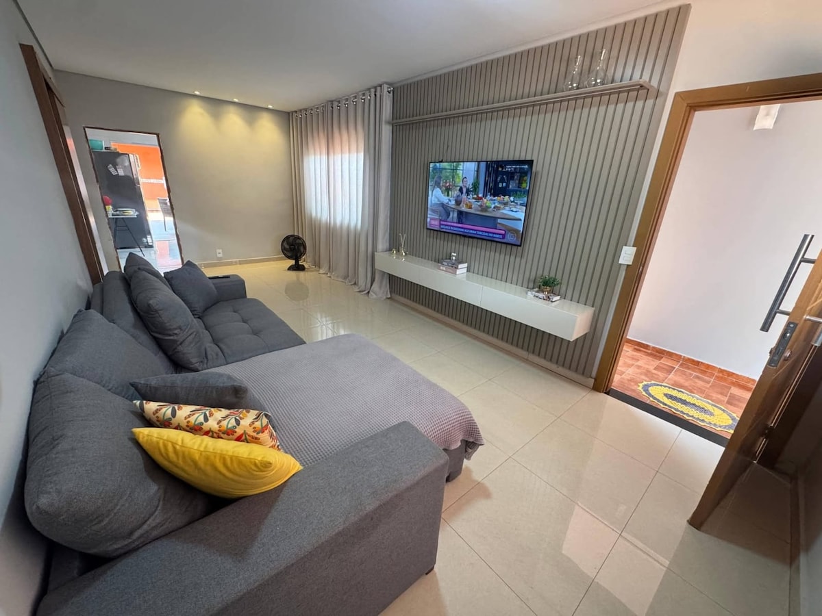 A lazer ou a trabalho, relaxe nesta acomodação tranquila, espaçosa e próxima a shopping, farmácia, conveniências e restaurantes. Casa ampla, sala de TV (canais abertos + app de treaming) com ar condicionado, sala de estar com mesa de trabalho, cozinha completa, 3 quartos com ar condicionados, 2 banheiros com chuveiro elétrico, varanda com churrasqueira, quintal e garagem para vários carros. *Área de churrasco EXCLUSIVA para uso dos HÓSPEDES até 22h.*