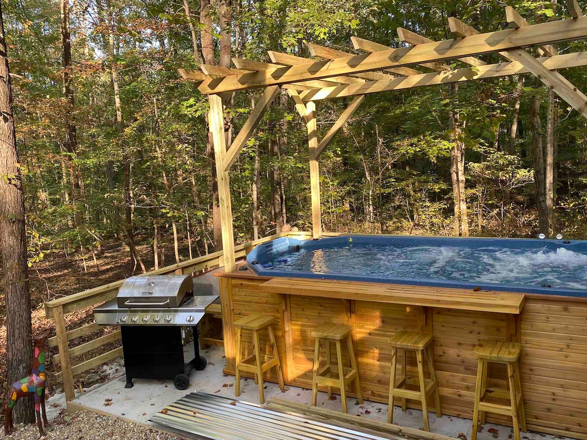 Entspanne dich bei diesem einzigartigen und ruhigen Kurzurlaub. Diese gemütliche Hütte mit 2 Schlafzimmern liegt auf Stelzen und verfügt über eine dreistöckige Terrasse mit einem Whirlpool. Die Hütte liegt auf 3 Hektar, umgeben von hoch aufragenden schwarzen Walnussbäumen und einem Bach, in dem du angeln und schwimmen kannst. In der Nähe gibt es viele Möglichkeiten im Freien. Ein Feuerstellenbereich mit Picknicktischen kann genutzt werden. Whirlpool! Bitte sieh dir vor der Buchung „Mehr anzeigen“ an und lies die vollständigen Details.