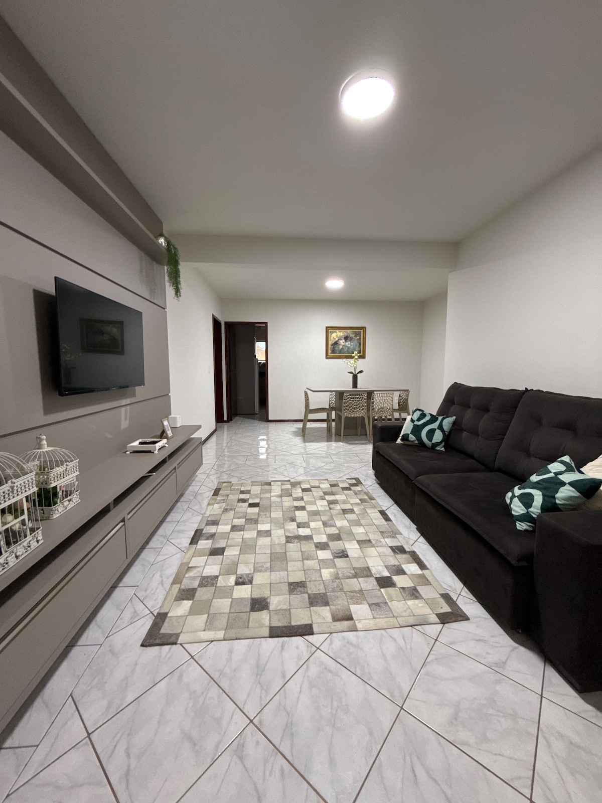 Apartment with 3 bedrooms Ground floor, no stairs, easy access. 1 suite with bathroom and A/C 1 double bedroom with A/C 1 single bedroom with fan 1 social bathroom 2 parking spaces Dining room with 6 chairs Fully equipped kitchen, stove, microwave, laundry room, dryer, refrigerator, coffee maker, Smart TV, digital cable TV Washing machine 500mb Wi-Fi Keyless access via digital lock. In the city center. 200 meters from restaurants, banks, hospital, church, pharmacy, school, and square!