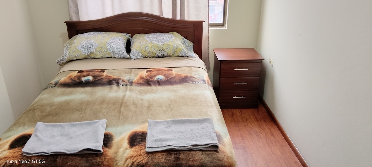 Es ist eine komfortable Wohnung im Erdgeschoss, Platz für 6 Personen ist ideal, wenn du Kinder oder ältere Erwachsene hast. Mit 2 Schlafzimmern: Das 1. Schlafzimmer hat ein Queensize-Bett. Das zweite Zimmer verfügt über: 1 Doppelbett und 2 Einzelbetten Es verfügt über WLAN Netflix-DIRECTV-Garage für ein Fahrzeug und einen elektrischen Pförtner. Unterkunft strategisch gelegen, einen Block vom Remigio Crespo und einen Block vom C-TRES entfernt bietet alles, was Sie für einen perfekten Aufenthalt benötigen. Wir sind nur einen 10-minütigen Spaziergang vom historischen Zentrum entfernt.