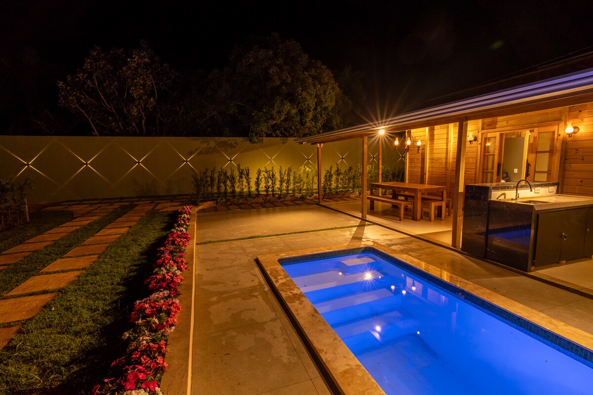 A casa fica a apenas cinco minutos da praça da Chapada, 5 quadras acesso em asfalto, e ao mesmo tempo, em um lugar muito lindo mesmo, em meio a uma imensa mata nativa, com grandes árvores no alto do terreno, e com as piscinas em um deck mirante. Um lugar muito familiar com clima extremamente agradável e lindo, para relaxar e se encantar pelo intimo contato com a natureza fascinante.