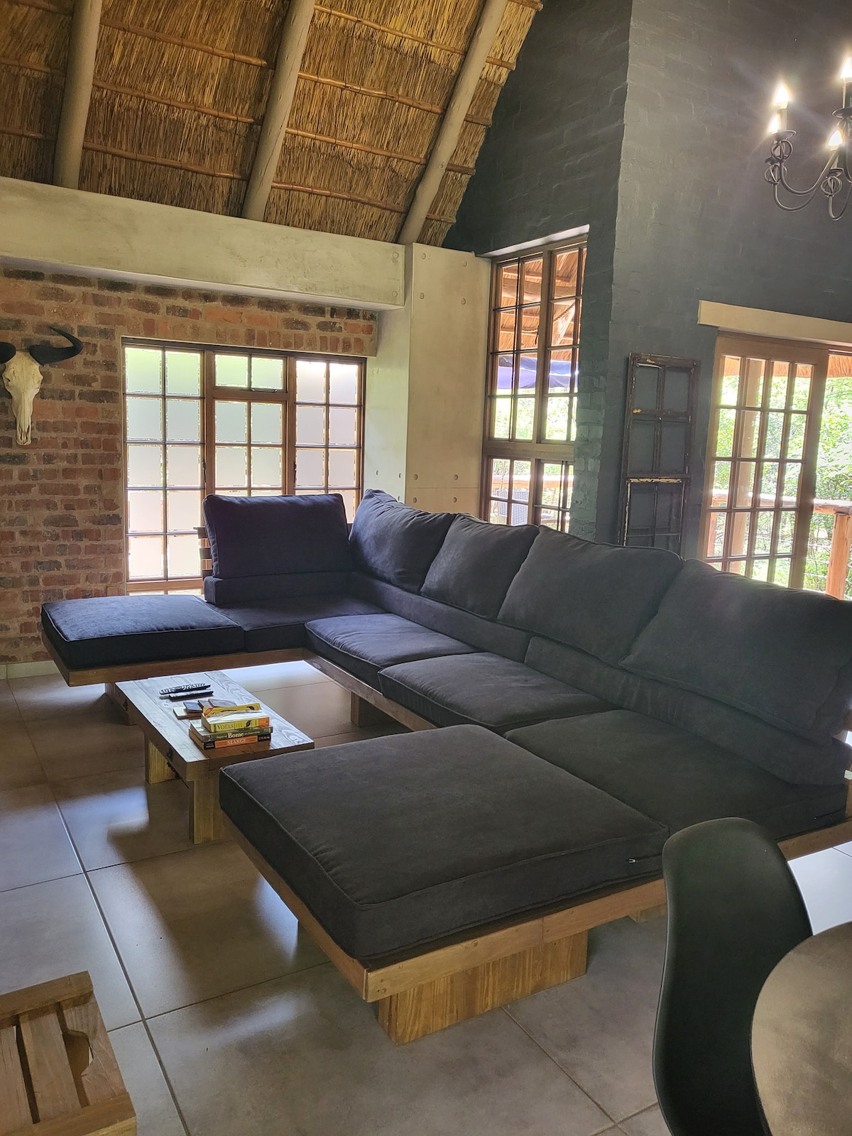 Landleben mit allen Annehmlichkeiten, die du in der Stadt genießen wirst. Ein sicheres Stroh-Chalet aus Stein gebaut. Gelegen auf einer 21 ha großen Buschland-Farm. Viele Vögel, Impala, Blesbok und Giraffen streifen herum. 1 Schlafzimmer mit Queensize-Bett und eigenem Bad. Offener Wohnbereich mit voll ausgestatteter Küche, Esszimmer und Lounge mit Queensize-Doppelschlafcouch und Dstv. Kühle Veranda zwischen Bäumen. Schöner Terrassengarten mit (Boma) Grillplatz. Überdachter Parkplatz. Pool kürzlich hinzugefügt.