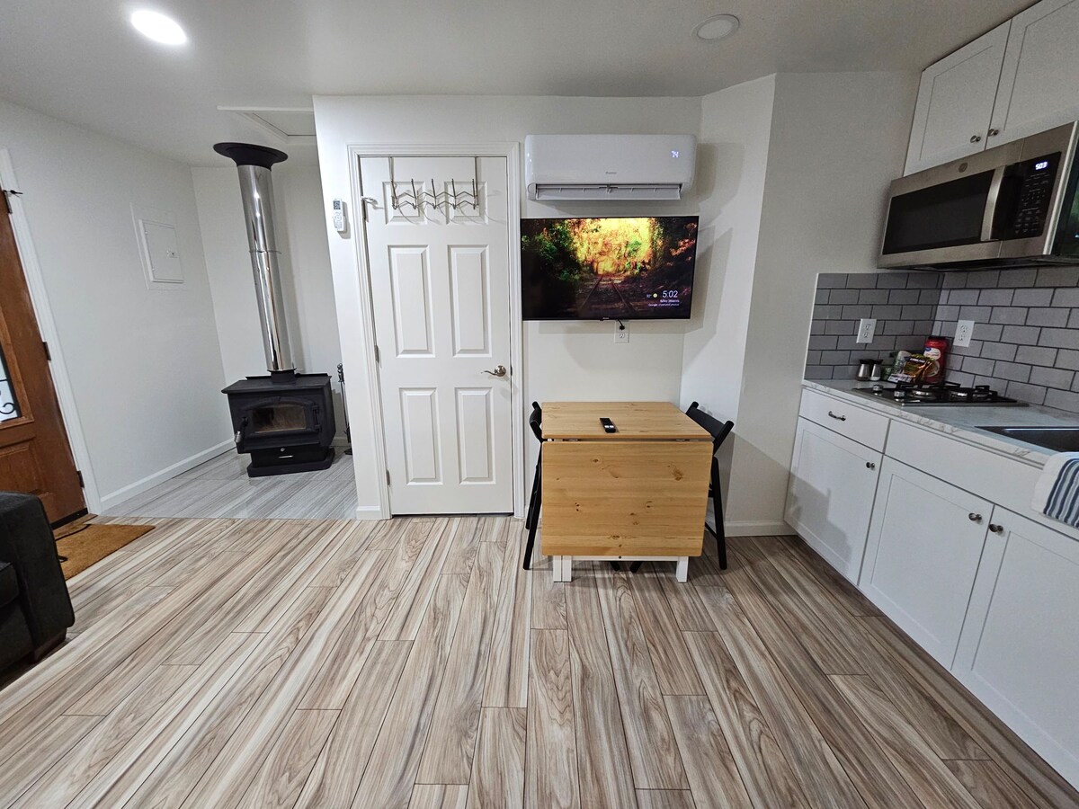 Enjoy a delightful modern stay at this unique tiny house. This home is fully equipped with a complete kitchen, living space, bedroom, and full bathroom. For a tiny home this place is impressively roomy! There's ample parking as well as an adorable front porch overlooking a gorgeous yard surrounded by woods. Conveniently located, perfect for couples or singles, amazing atmosphere indoors and out.