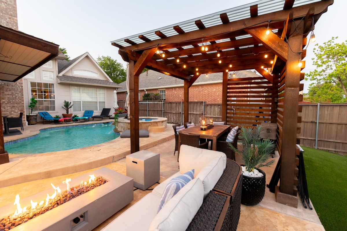 Gilded Getaway – Hosted by All Season Escapes Welcome to the Dallas Modern Retreat, where sleek design meets cozy comfort. ✨ Highlights: 🏡 Stylish living spaces & peaceful bedrooms 🎮 Game room with life-size yard games 🔥 Fire pit with Adirondack seating 💦 Seasonal stock tank pool & hot tub 👢 Vibrant Texas-style mural wall 📽 Outdoor movie setup under the stars 🍽 Fully equipped kitchen for entertaining 🌆 Just minutes from downtown Dallas Your ultimate Dallas escape—book your stay today!